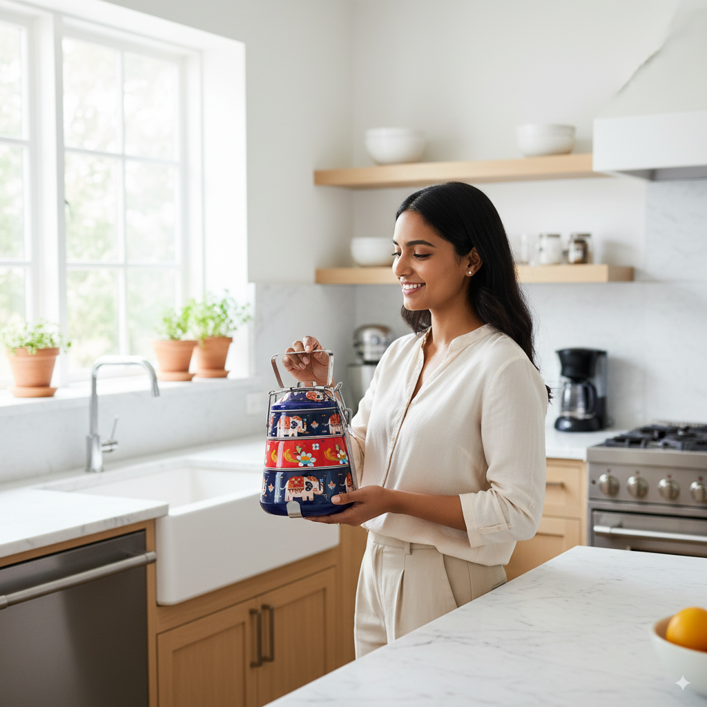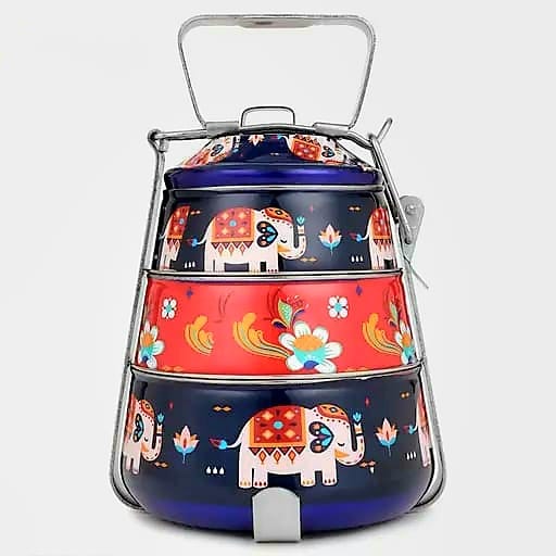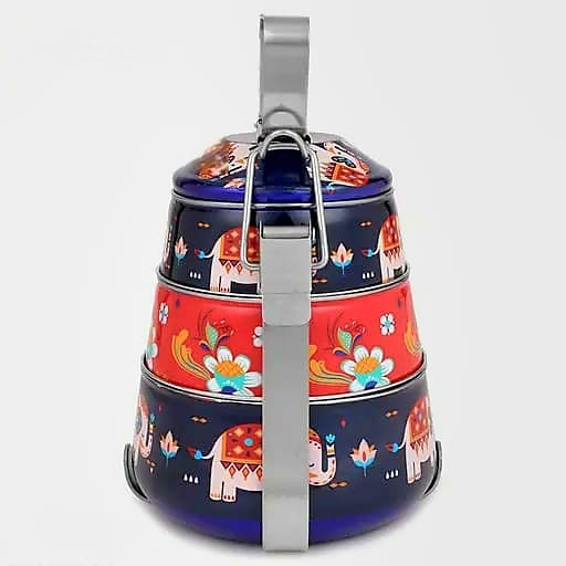 Hand Painted Stainless Steel Tiffin Lunch Box | 3 Tier Pyramid Bento Box for Adults & Kids | Eco-Friendly Traditional Indian Dabba Style