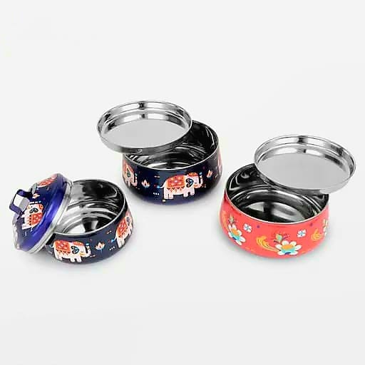 Designed in traditional Indian dabba style, it features three stackable compartments for organized meals and a total capacity of 1260 ml. This eco-friendly bento lunch box is perfect for adults and kids, whether at work, school, or picnics. Durable, reusable, and artistically crafted—say goodbye to plastic and enjoy meals in style.